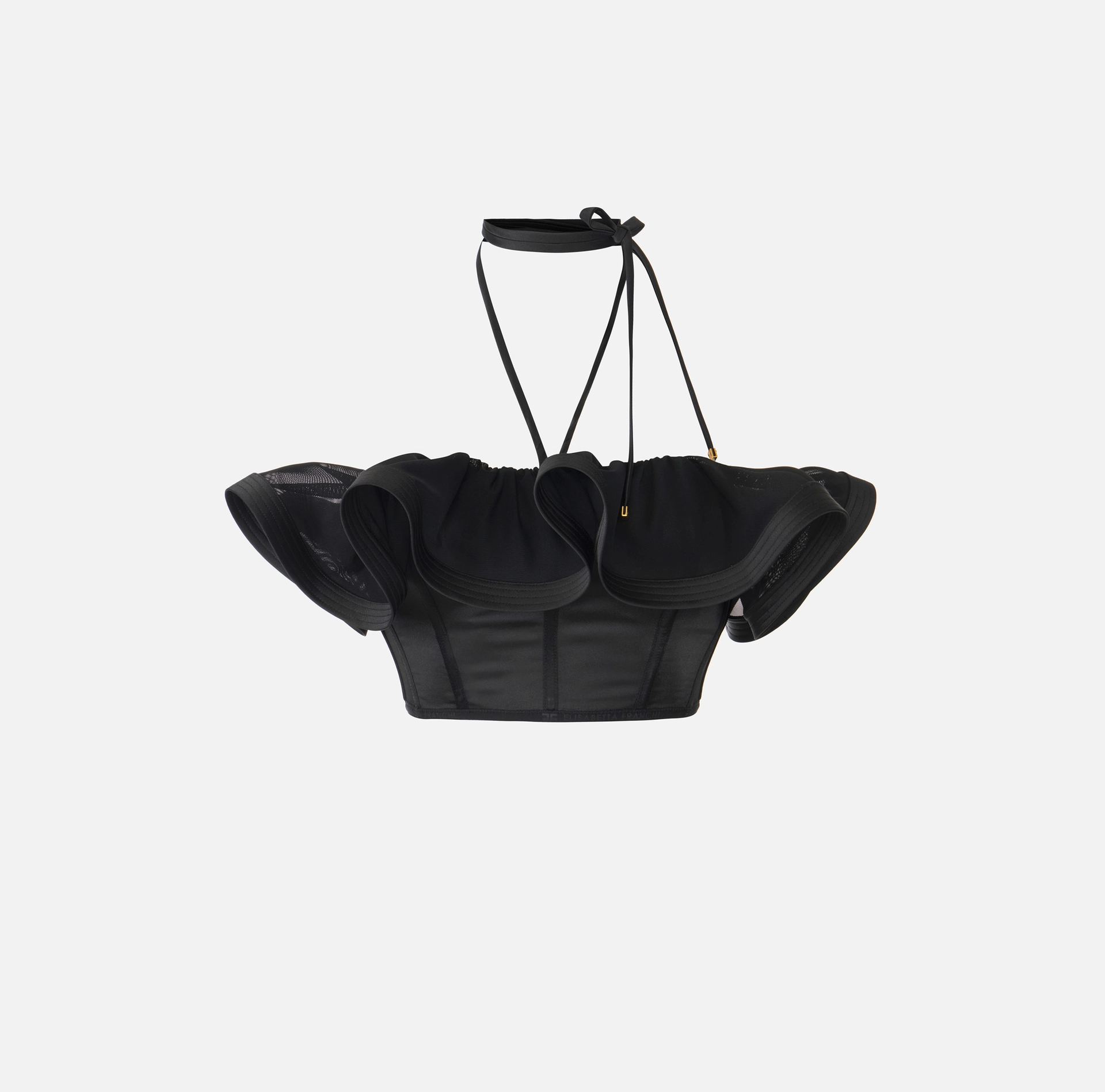 Top typu bandeau wykonany z satyny. Głównym elementem jest olbrzymia falbana: wykonana z tiulu, tworzy ona subtelny kontrast materiałowy, usztywniona jest wewnętrzną krynoliną pozwalającą uzyskać przyciągającą wzrok objętość, a utrzymywana jest tasiemką w stylu chokera. Krój dopasowany.
