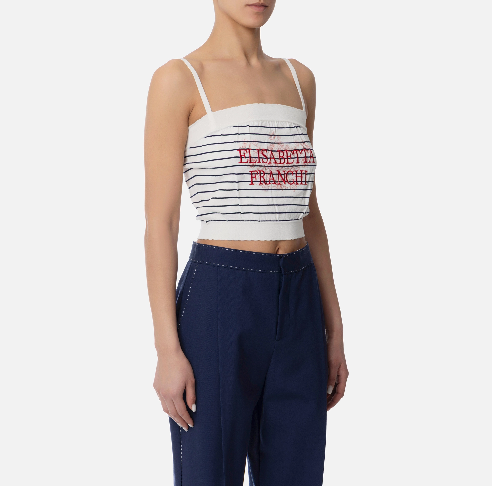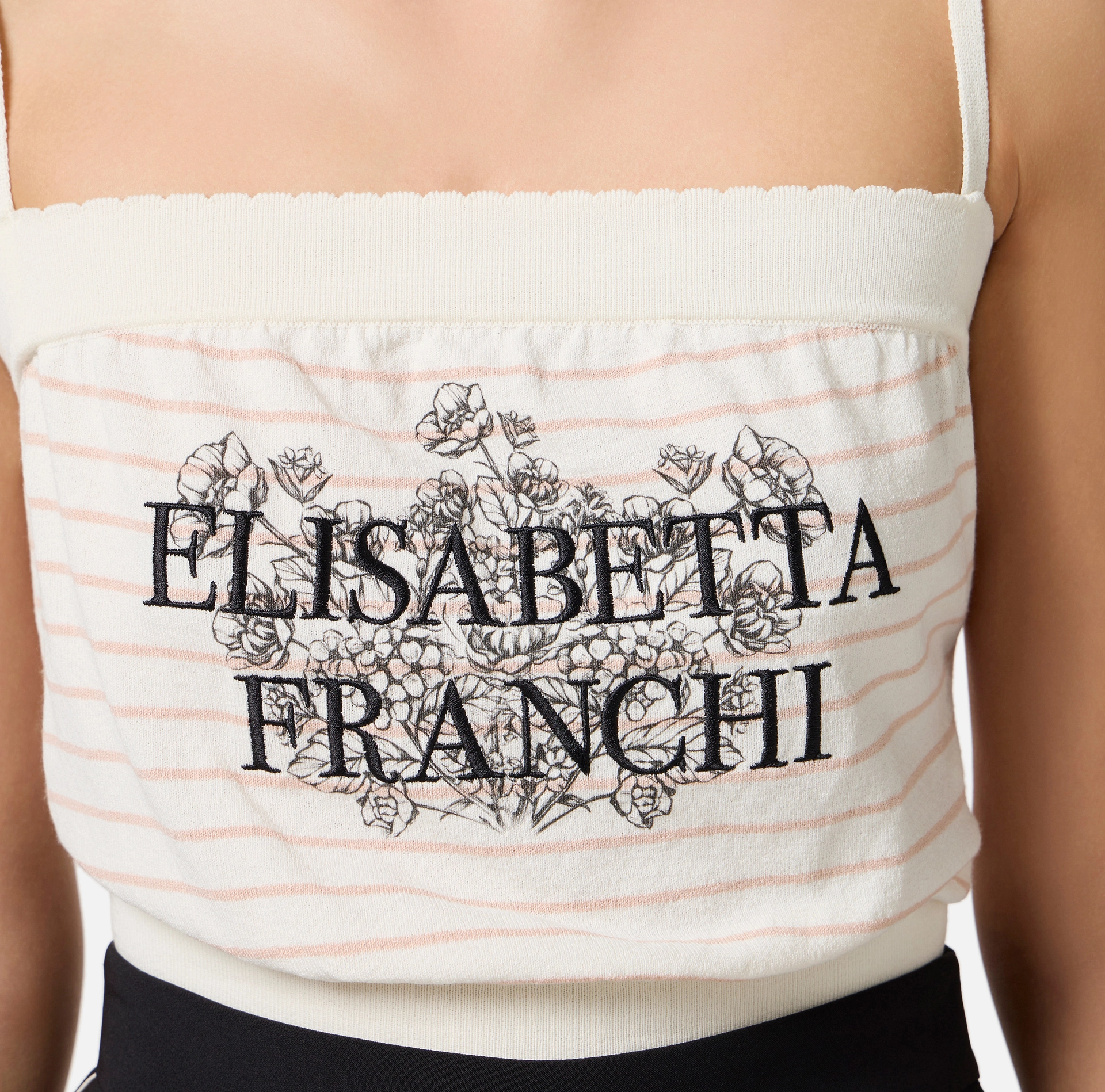 Top z wiskozy ze stretchem z cienkimi ramiączkami. Charakteryzuje się motywem pasków w połączeniu z nadrukiem kwiatowym i wyszywanym logo z przodu. Brzegi posiadają niewielkie ząbkowanie. Prosty krój.