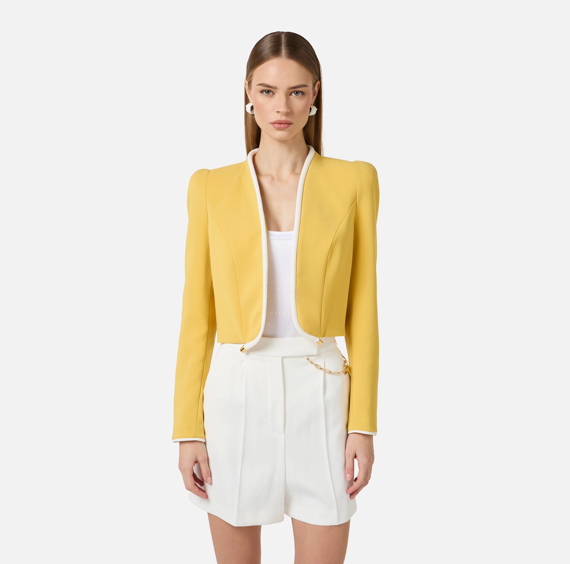 Żakiet z lekkiej krepy z wysokim kołnierzem i długimi rękawami. Charakteryzuje się kontrastującą lamówką, wykonaną cylindrycznie z efektem 3D i ozdobioną końcówkami ze złoconego metalu, wnoszącymi nutę blasku. Prosty krój.
