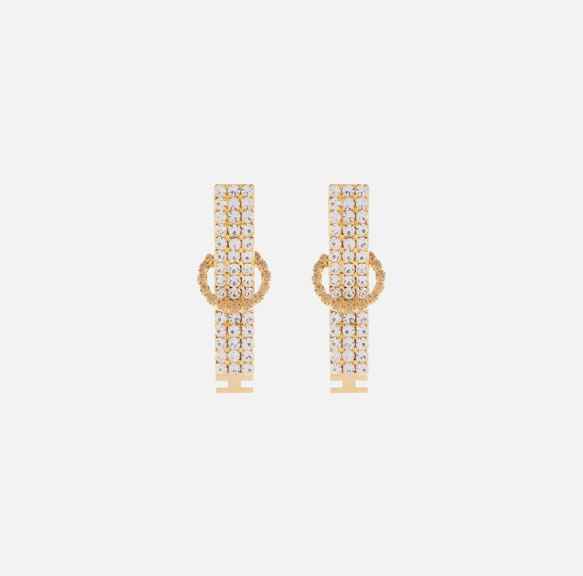 Kolczyki wykonane z metalu ze złoconym wykończeniem, ozdobione okrągłym detalem wykładanym kryształkami. Logo na dole.